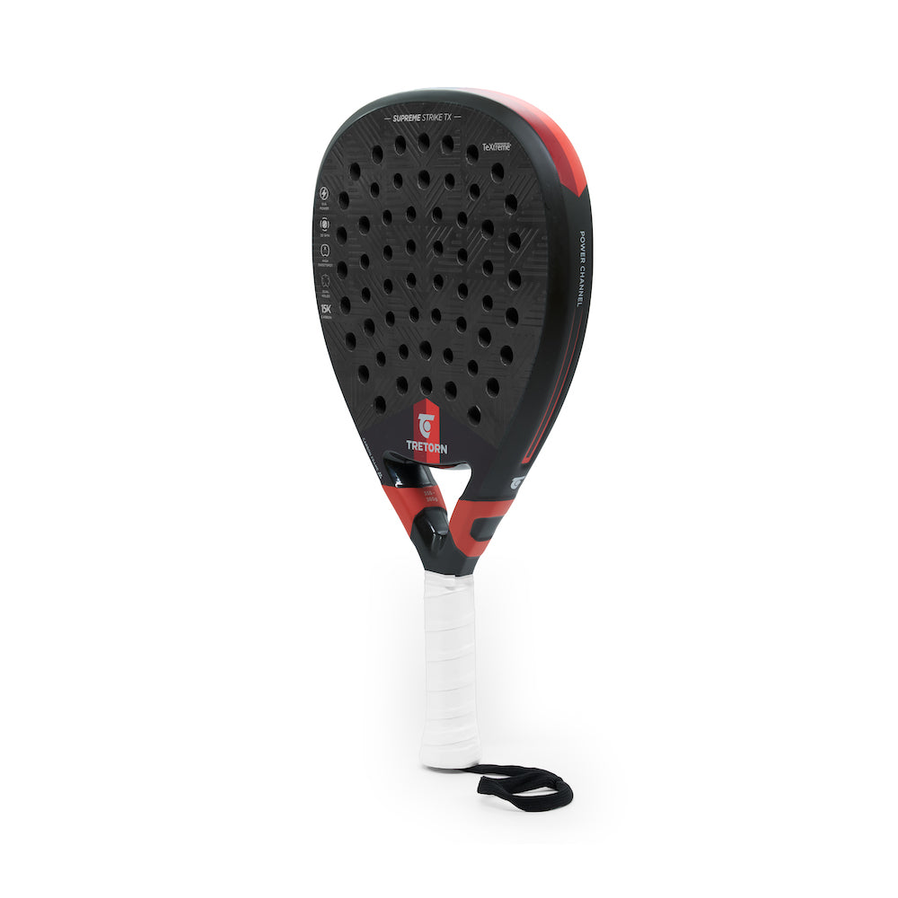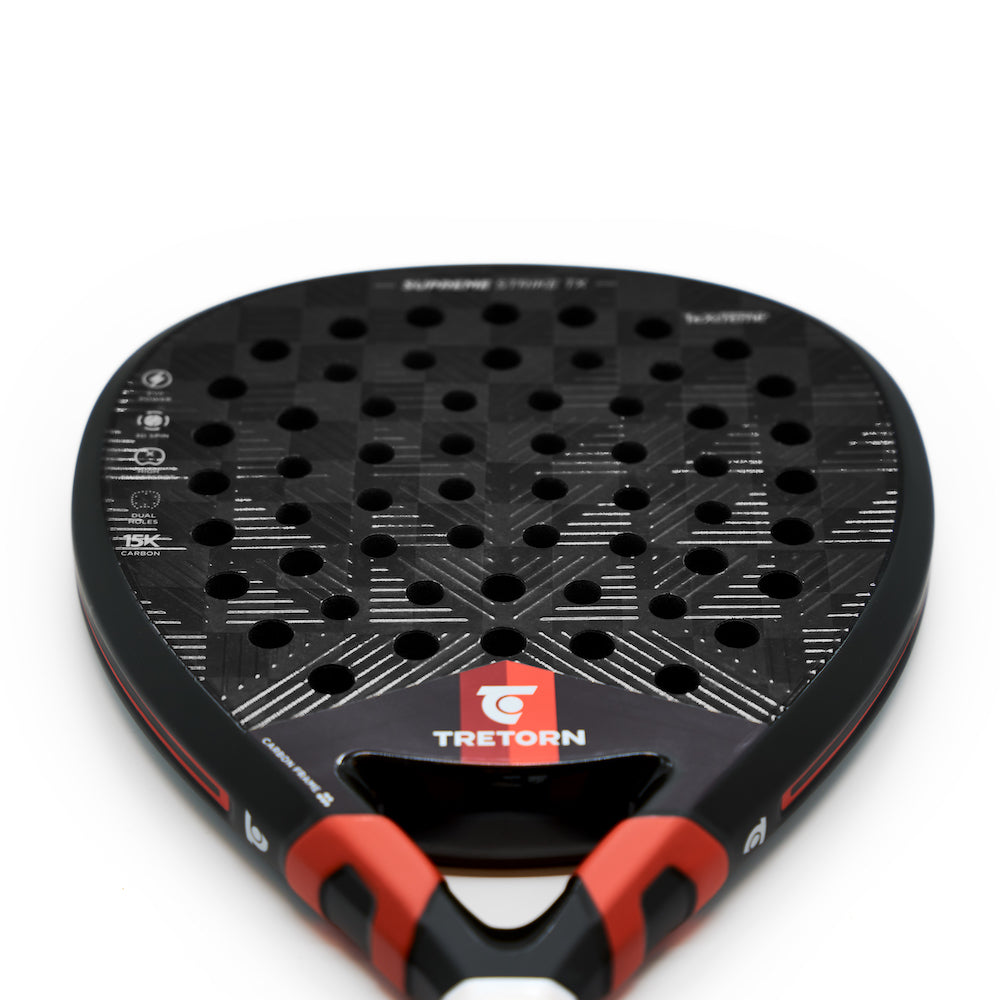 Oplev kraften i SUPREME STRIKE TX! Designet med præcision og innovation for at give dig en fordel i dit offensive spil. SUPREME STRIKE TX er udviklet til erfarne spillere. Ketsjeren er udstyret med et 15K kulfiberlag fra svenske TeXtreme®, som er et tyndere, stærkere og mere holdbart overfladelag, der giver en hurtigere respons sammenlignet med traditionelle kulfiberkonstruktioner. Oplev et nyt niveau af hastighed og sensation i hvert slag. Med vores EVA POWER-kerne og en høj sweetspot er resultatet en ekstremt responsiv powerketcher til spillere, der mest bruger deres offensiv til at dominere spillet. Uanset om du slipper løs et tordnende smash eller udfører et perfekt placeret dropshot, leverer SUPREME STRIKE TX enestående præstation med hvert slag. Ketsjeren er også udstyret med et DUAL-hole-mønster, der optimerer ketsjerens kontaktpunkter og forbedrer evnen til kontrollerede slag, selv når du rammer uden for ketsjerens sweetspot. Resultatet? Konsekvent kraft og præcision, der giver dig mulighed for at bestemme spillets tempo. Derudover har ketcheren et multidirektionelt 3D-mærke, strategisk designet til at forbedre dit spin for alle typer slag, hvilket bringer et nyt niveau af elegance, der forvirrer dine modstandere og holder dem i tvivl om dit næste træk.